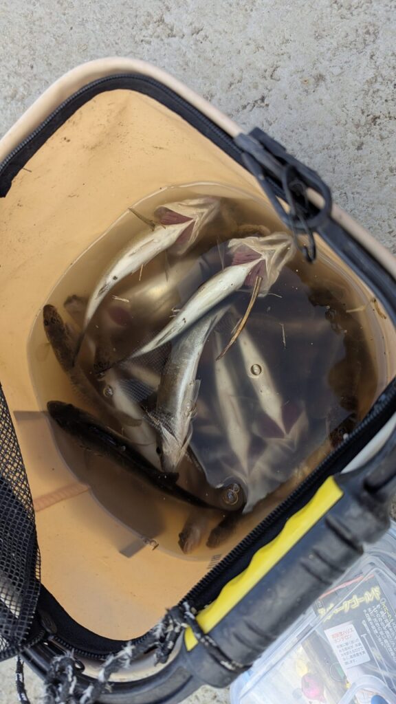 釣りを開始して1〜2時間ほどでしょうか。持参したバケツは、あっという間にセイゴとハゼで賑やかに。