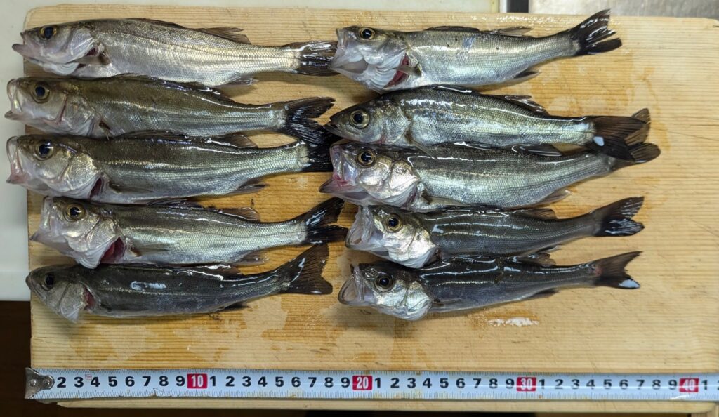 どうですか、この立派なセイゴ! 20cmを超える良型も混じり、合計10匹。