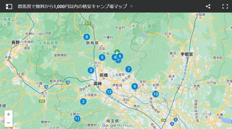 その中で無料から1,000円以内で格安で利用できるキャンプ場が12か所もあったものをGoogleMapでまとめてみました。