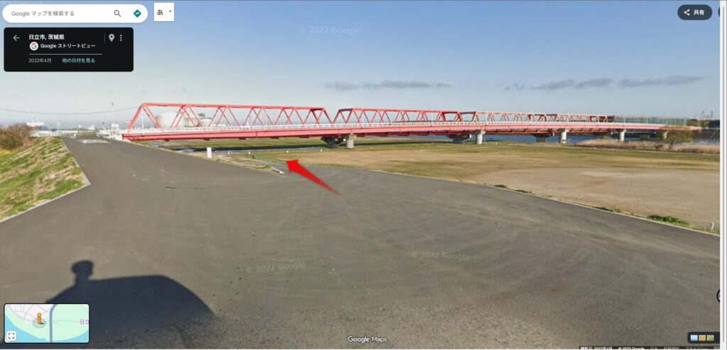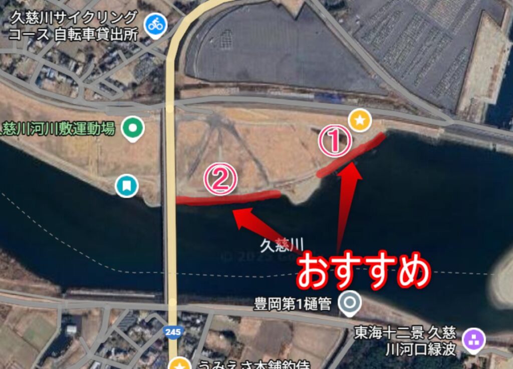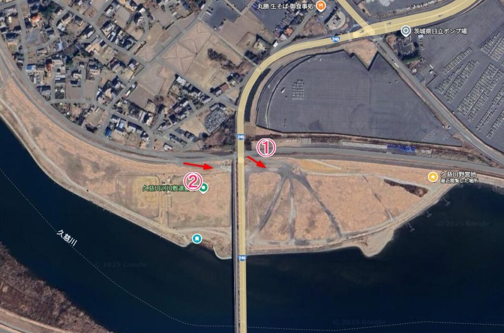 ②の方は河川敷に降りていく道がありますが、分かりやすいです。