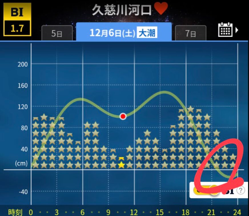 上記のタイドグラフの場合、20時ぐらいからは潮が引いてしまい遠くに投げないと釣れにくくなってしまうので注意しましょう。