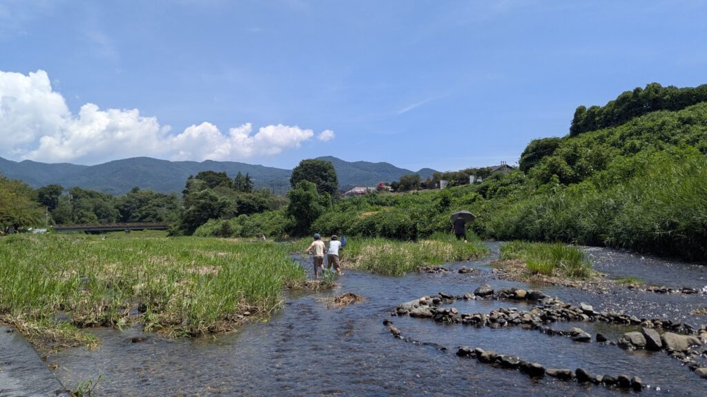 目の前に広がるのは、記憶の中に焼き付いていた、あの光景。遠くに見える武尊の山々、どこまでも青い空、そして太陽の光を浴びて輝く川面。