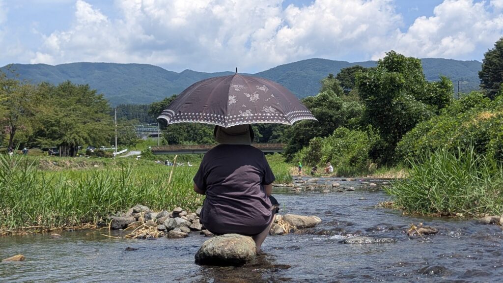 川の真ん中の石に腰掛け、日傘をさして静かに過ごす女性の姿。
